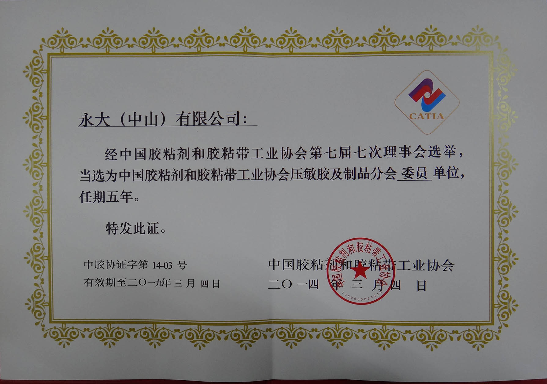 *公司连任“中国胶粘剂和胶粘带工业协会压敏胶及制品分会副主席单位”