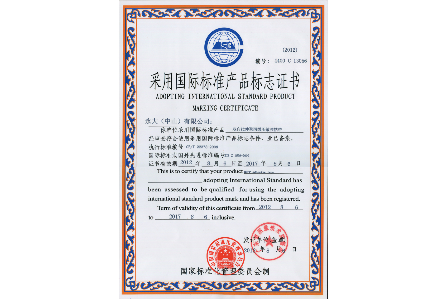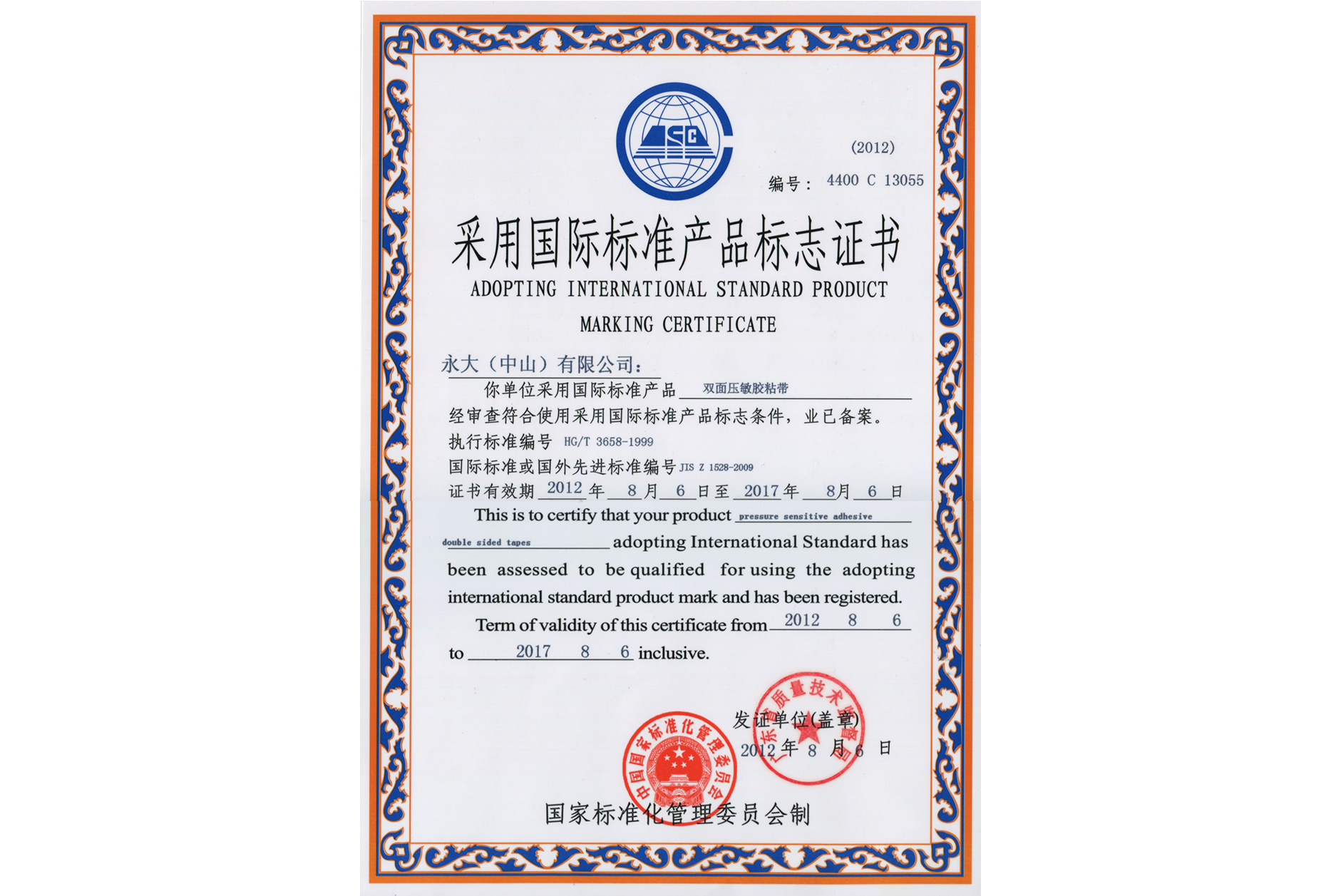 *公司再次当选为“中国胶粘剂标准化技术委员会压敏胶制品分技术委员会副主任委员单位”